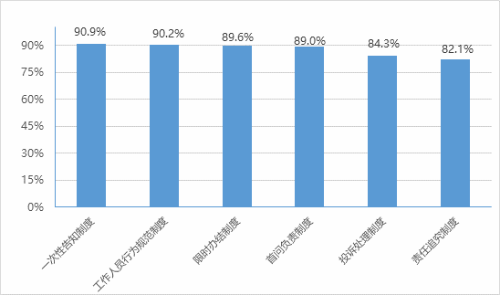 各地区在推进政务大厅建设的过程中,建立了较完善的监督机制,实现了对办事过程的立体式监控。77.2%的政务大厅建立了电子监察系统,82.5%的政务大厅开展了视频监控,74.1%的政务大厅设立了现场投诉受理区,89.7%的政务大厅提供了电话监督方式。在规范涉企收费方面,不少地方通过政务大厅实施“一个窗口收费”,要求进驻单位必须公开和严格执行收费项目及其标准,实行收费报批、集中收缴、统一划转、收缴分离,有效规范了进驻单位涉企收费行为。全国政务大厅建立一次性告知制度、工作人员行为规范制度的比例超过90%;建立限时办结制度、首问负责制度、投诉处理制度、责任追究制度的比例超过80%。此外,近40%的政务大厅建立了超时默许制度,在事项办理超过承诺时限后启动该程序,24小时内办结。上海、江苏、浙江、福建等地还探索推行窗口受理无否决权制度。