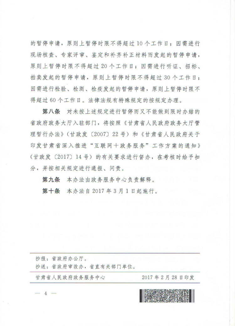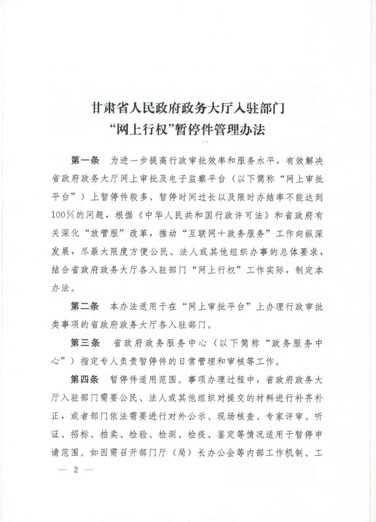 甘肃省人民政府政务服务中心关于印发《甘肃省人民政府政务大厅入驻部门“网上行权”暂停件管理办法》的通知